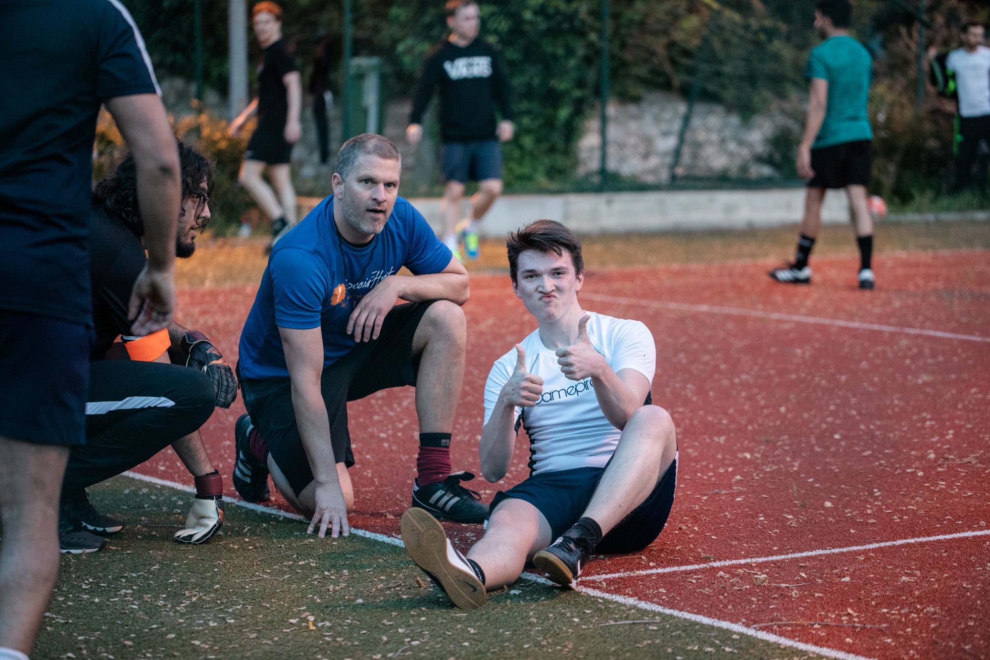 Das Reboot Develop-Fußballturnier fand später am Abend statt, daher mussten wir uns darauf vorbereiten. Wir hatten zuvor ein Team gemacht und uns offiziell beworben und sogar niedliche Fußballuniformen für alle angefertigt. Wir zogen uns um, nahmen unsere Fackeln, Rauchbomben und Schlagringe und machten uns auf den Weg. Nur ein Scherz, wir haben nur ein bisschen Alkohol mitgebracht. Wir haben zwei Spiele gespielt, eines gegen Cecil United, das wir mit 8: 0 (lol) gewonnen haben, und das andere gegen SpecialEffect, das wir mit 3: 1 gewonnen haben. Das bedeutete, dass wir bis zum Finale am nächsten Tag fertig waren.
