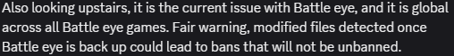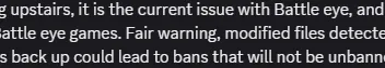 Leider müssen wir erstmal damit leben und abwarten. Ihr solltet zwecks der BattlEye-Problematik die Rat der Devs folgen und nichts an den Dateien ändern. Egal ob Client - oder auf eurem Server. Gerne könnt ihr uns aber weiterhin Fehlermeldungen im Bezug auf BattlEye hier reinschicken damit wir sie weiterleiten können: Bug Reports