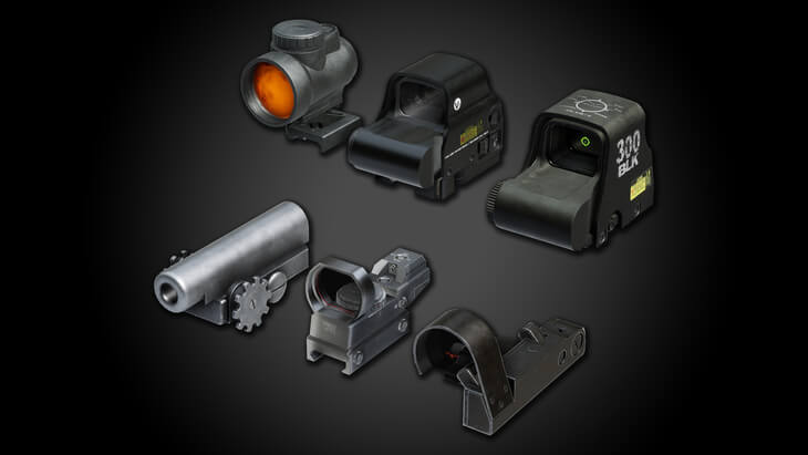 Verschiedene Visiere für verschiedene Waffen, das auffallende ist unten links, das ist ein spezielles Zielfernrohr für die M1.