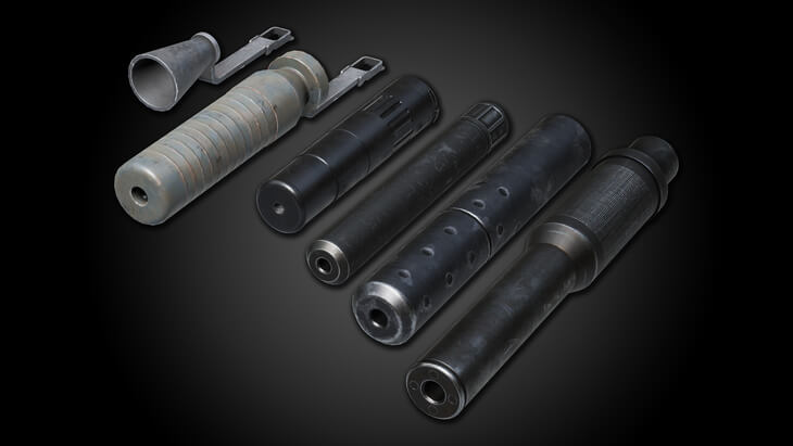 Verschiedene Schalldämpfer, wobei die beiden linken spezielle Schalldämpfer und eine Blitz-Mündung für die M1 sind.