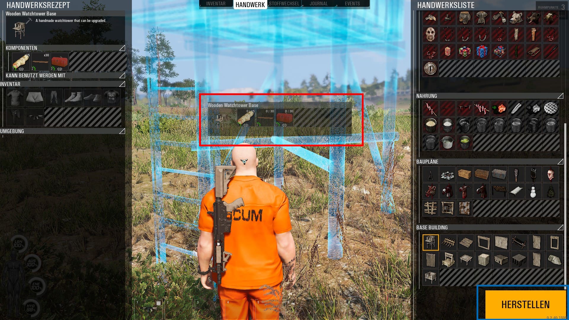 Solltet ihr alles soweit an Komponenten zusammen haben, könnt ihr euren ersten Base Building Gegenstand herstellen (blaue Markierung). Dieser ist dann nach dem Herstellen fertig und kann von euch, je nachdem um was es sich dabei handelt, bestiegen oder auch genutzt werden.