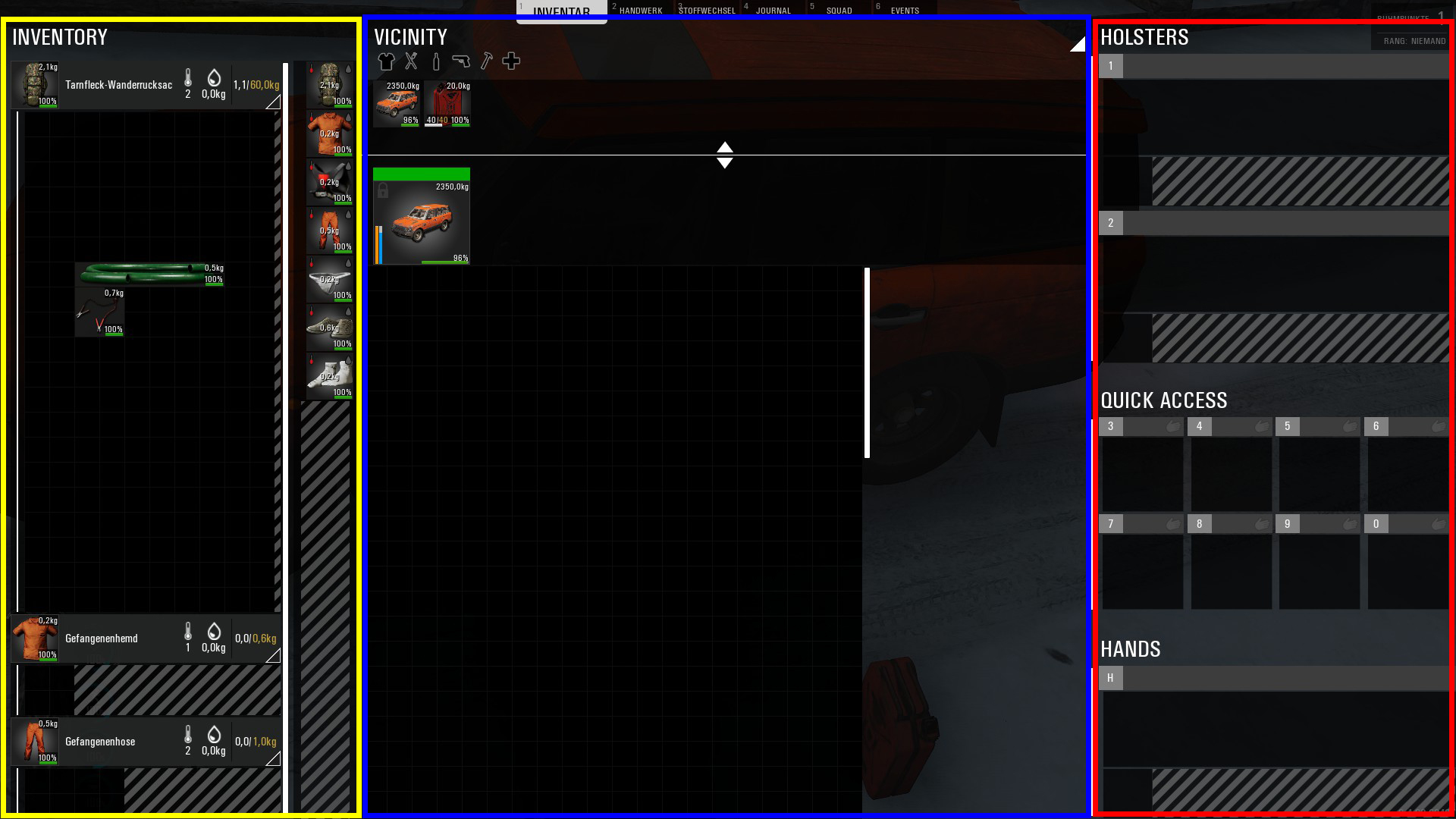 - Der blaue Bereich zeigt die Umgebung an. Alles, was sie um euren Charakter befindet (in diesem Fall ein SUV) wird angezeigt. Ihr könnt dort nach Gegenständen filtern (dafür gibt es unter "Vicinity" die Icons) oder eben auch hier auf die Slots zugreifen.