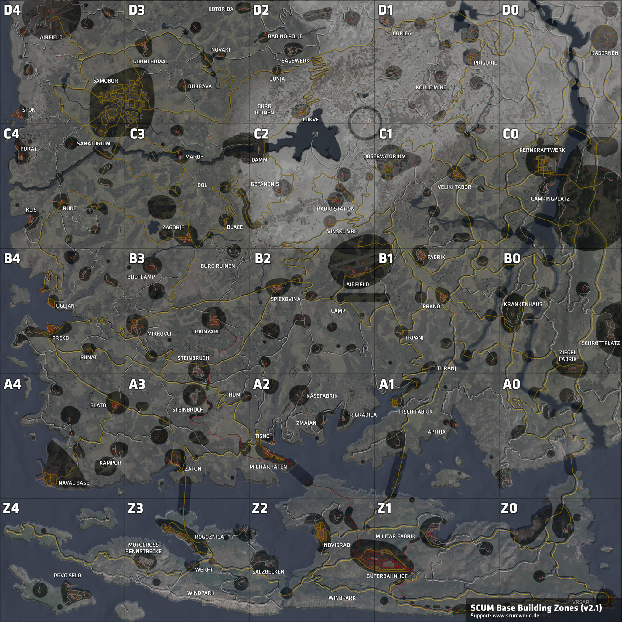 Hinweise: Die dunklen Bereiche auf der Map sind nicht bebaubar. Dort ist kein Base Building möglich! Auf den kleinen Inseln ist das Bauen teilweise möglich! Diese Guide wurde am 14. April 2021 aktualisiert.