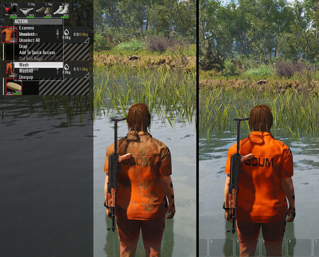 - Außer zu essen und sich dabei nicht den Kopf wegzublasen, ist Hygiene auch ein wichtiger Bestandteil des Überlebens auf der SCUM-Insel. Daher ist es ein Muss, saubere Kleidung zu tragen und sich mit sauberen Lappen zu verbinden. Nehmen Sie etwas Seife, stellen Sie sich an eine Wasserfläche und waschen Sie den ganzen Schmutz weg!