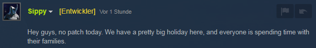 Es ist wieder Freitag, der 1. November 2019. Im Survival SCUM eigentlich Patch-Day, wenn da nicht die Entwickler Feiertage hätten. Relativ früh gibt Wonderwe1ss (Sippy) uns eine Rückmeldung, ob heute ein Patch zu erwarten ist. Er antwortet auf die Frage wie folgt: "Hey Leute, heute kein Patch. Wir haben hier einen ziemlich großen Feiertag und jeder verbringt Zeit mit seinen Familien."
