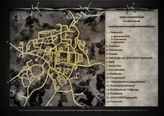Mittlerweile ist zwar fast das komplette Scumworld.de-Team als Alpha-Tester oder gar Content-Creator unterwegs, das hat uns aber leider keinen exklusiven Zugriff auf hochauflösende Grafiken beschert. Beurteilt die Qualität des Stadtplans also unter dem Aspekt eines nach-bearbeiteten ingame-Screenshots. Dafür kann er sich dann doch sehen lassen