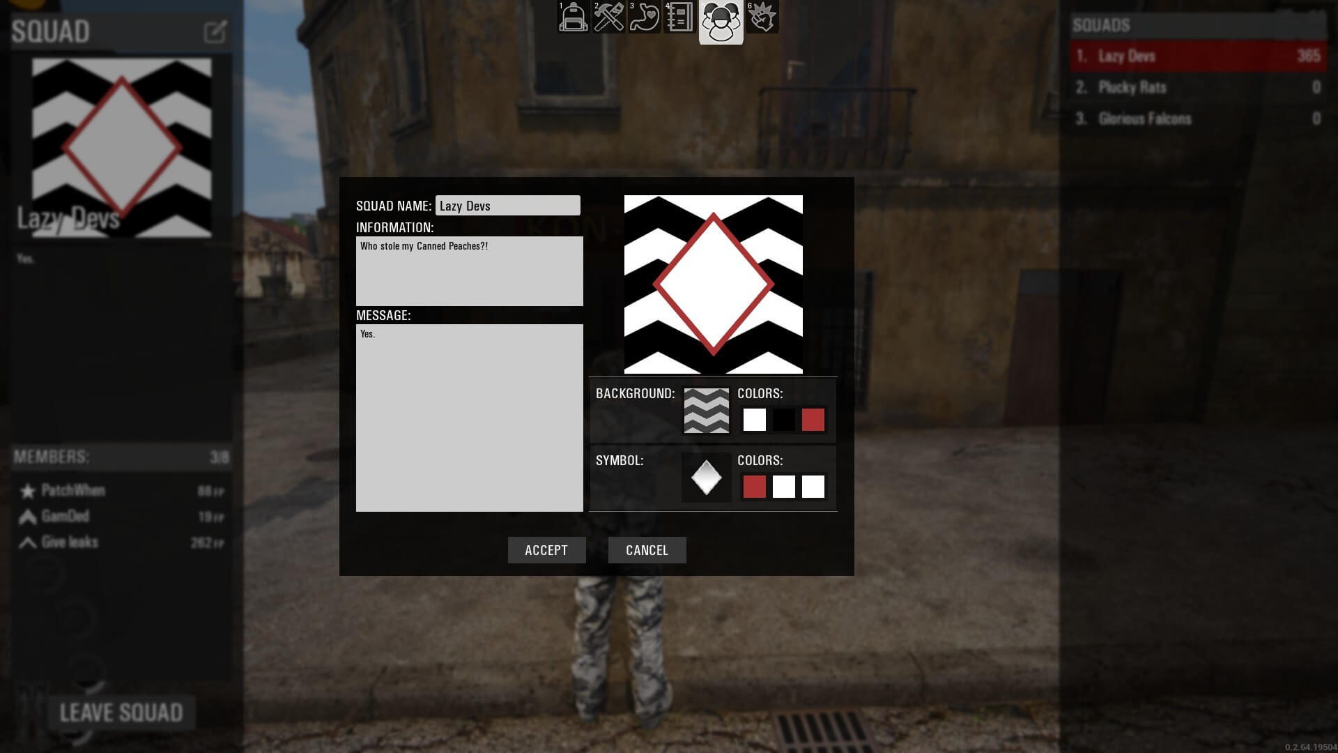 - Nachricht: wird verwendet, um eine Nachricht an die Mitglieder deines Squads zu senden (Nur der Anführer und Rang 3 Mitglieder können das bearbeiten)