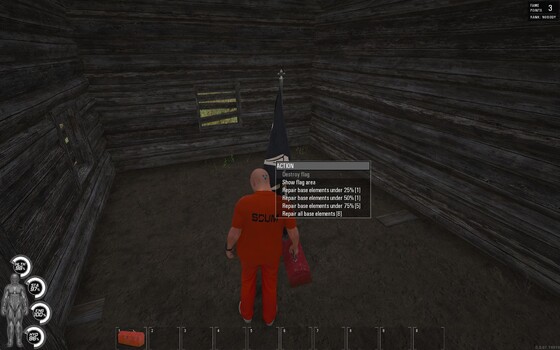 Ihr könnt eure Basis jetzt direkt an der Flagge reparieren. Wenn ihr mit der Flagge interagiert ("F"), könnt ihr entscheiden, Elemente mit einer Haltbarkeit von weniger als 25, 50, 75 Prozent oder alle zu reparieren.