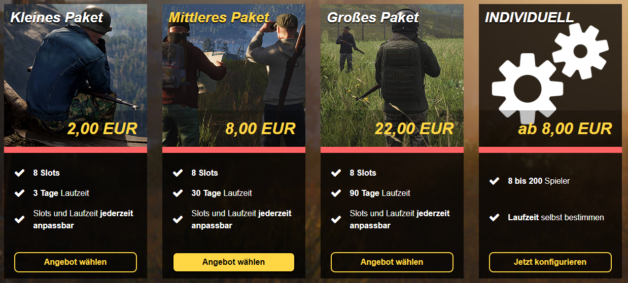 Bei Nitrado erhaltet ihr verschiedene Pakete. Angefangen von einem kleineren Paket für 2,00 Euro bis hin zu einem individuellen Paket, was ab 8,00 Euro los geht. Unter anderem können bis zu 200 Spieler (sofern das SCUM unterstützt) sich auf dem Server herumtreiben. Außerdem kann im individuellen Paket die Laufzeit selbst bestimmt werden, was bei dem kleinen und mittleren Paketen nicht geht. Dort ist die Laufzeit vorgegeben.