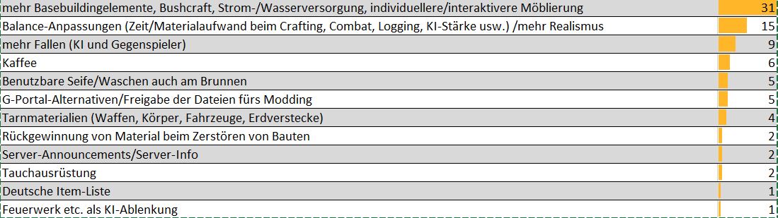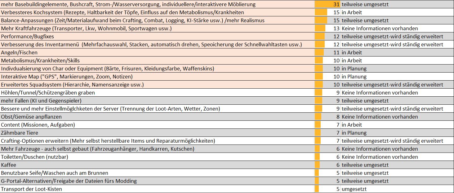 Man könnte das jetzt noch beliebig nach anderen Parametern auswerten - machen wir aber an der Stelle nicht. Sichtbar wird, dass fast alle Wünsche aus den Top25 schon ganz oder teilweise umgesetzt oder geplant sind. So schlecht liegen die Entwickler also gar nicht mit ihrer Richtung. Ob die Spieler mit der jeweiligen Priorisierung oder Umsetzung zufrieden sind steht noch mal auf einem ganz anderen Blatt. Bemerkenswert ist der Vergleich mit den Wünschen der Spieler aus anderen Teilen der Erde-vor allem, wenn man in den englischsprachigen Raum schaut oder Richtung Südamerika. Insbesondere bei solchen Sachen merke ich, wie unfassbar schwer es für die Entwickler sein muss, hier eine zufriedenstellende Balance für den gesamten Markt herzustellen.
