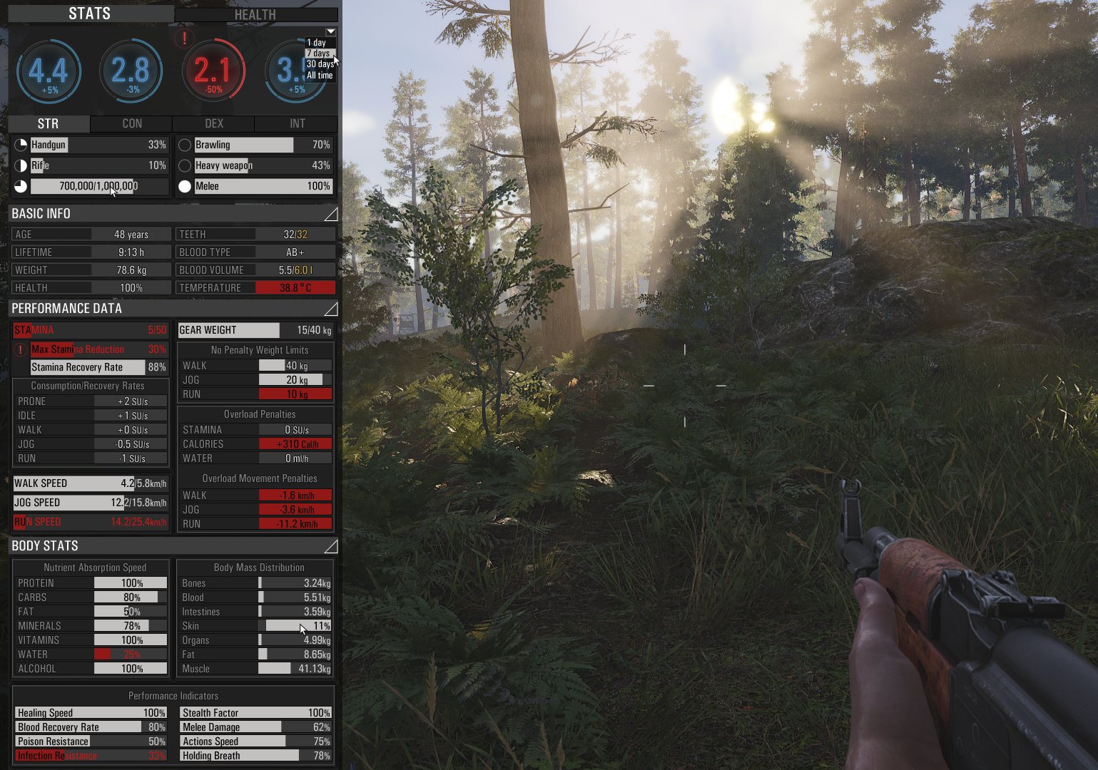 SCUM neuestes und wohl auch aufregendstes Update 0.5 hat viele Überraschungen für uns. In erster Linie natürlich das neue Stoffwechsel-System, woran seit Wochen schon gearbeitet wird. Tomislav Pongrac hat nun einen ersten Screenshots dessen enthüllt, um auch die Gemüter in der Community dazu zu beruhigen - besonders bezüglich dem Survival-Aspekt von SCUM. Schauen wir einfach mal in den kürzlich auf Twitter veröffentlichten Screenshot rein: