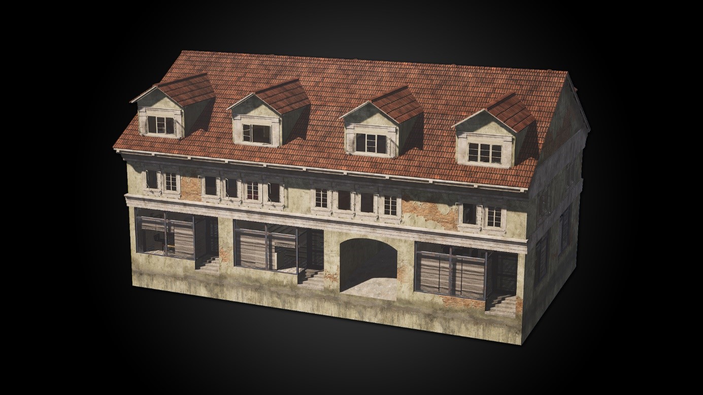 Niedriges Wohnhaus mit kleinen süßen Läden.