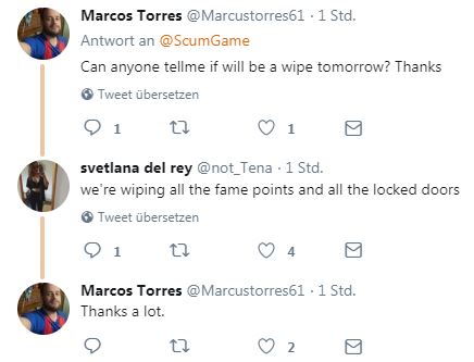 In SCUM stehen morgen am Freitag den 15. Februar 2019 Wartungsarbeiten an. Das geht aus der letzten Kurz-News, die uns die Entwickler von Gamepires vor 2 Stunden auf Twitter hinterlassen haben (wir berichten), hervor. Nun gibt es weitere Informationen zur anstehenden Wartung und den damit verbundenen Patch. Fest steht, es wird einen Wipe der Server geben, der eure Ruhmpunkte und verschlossenen Türen (Schlösser) zurücksetzt. Tena (Marketing Managerin) hat diesen Wipe der Server auf Anfrage eines SCUM-Spielers bestätigt: