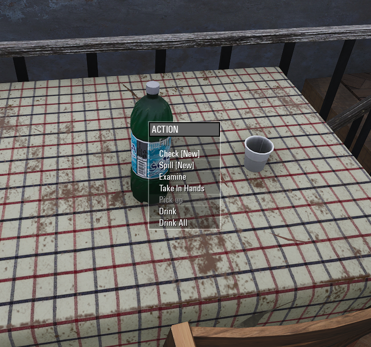 Wenn ihr „F“ auf einem Behälter mit Flüssigkeit haltet, habt ihr zwei Möglichkeiten – prüfen (check) und umfüllen (spill). Mit der „Check“ -Funktion erhaltet ihr eine Benachrichtigung, welche Flüssigkeit sich im Behälter befindet.