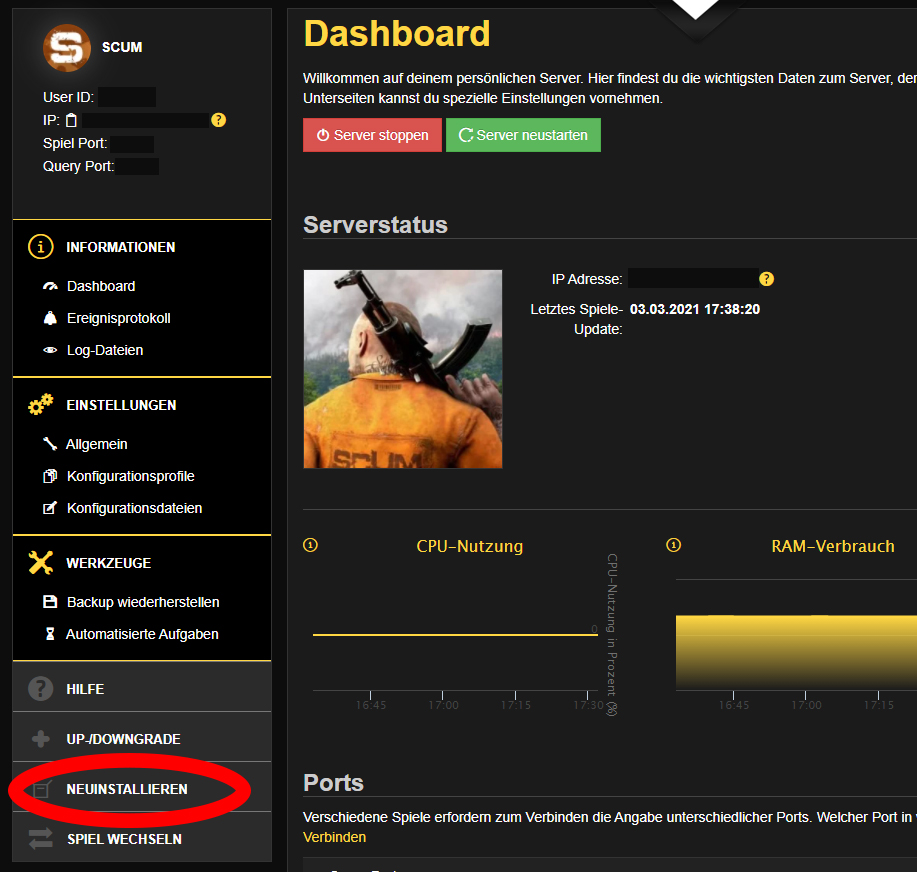 - Wir wollen ihn nun aber zurücksetzen, d.h. wie im Screenshot 2 markiert, klicken wir auf Neuinstallieren. Ihr werdet gewarnt, ob ihr das Spiel SCUM wirklich neu installieren wollt. Dabei werden (wie oben beschrieben) ALLE Spielstände und Konfigurationen des Gameservers gelöscht. Seid ihr euch der Gefahr bewusst, so klickt ihr einfach auf "NEUINSTALLIEREN" und schon startet die gewünschte Option. Das kann natürlich ein wenig dauern, daher habt einfach Geduld und schaut gelegentlich im Webinterface rein, wie der Stand ist.