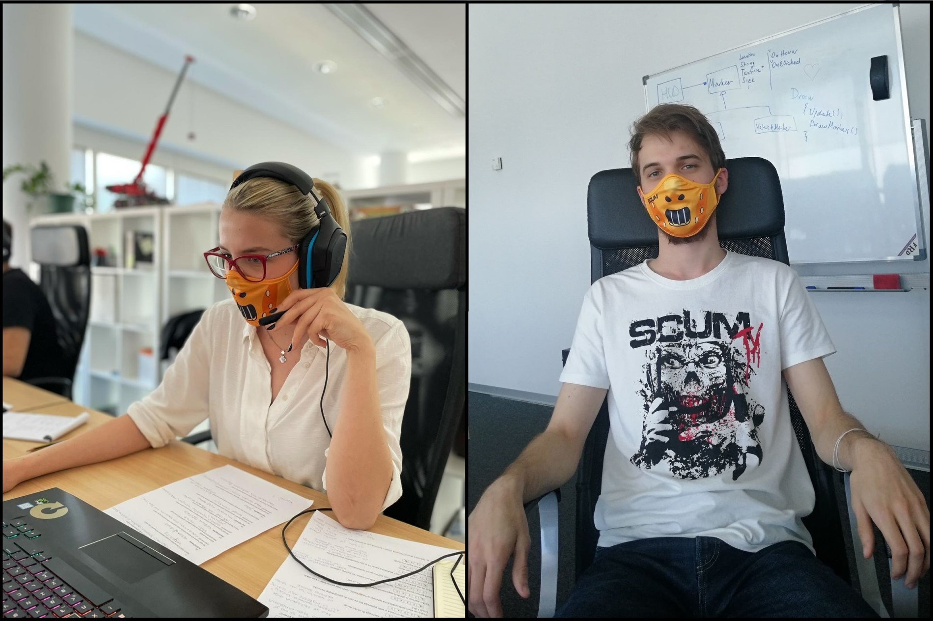 Wir haben dem Supporter-Paket#1 Dateien hinzugefügt, mit denen ihr eure eigenen Masken mit dem SCUM-Motiv drucken könnt, damit ihr gleichzeitig repräsentieren und sicher bleiben könnt! Hier sind ein paar der DEVs, die peinlich damit posieren, weil ich sie dazu gebracht habe: