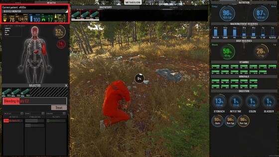 Wenn du die Verletzung auswählst, findest du den Reiter/Balken für die Behandlung. In der Mitte des Bildschirms haben Sie die Möglichkeit, die Gegenstände, die Sie zur Behandlung verwenden möchten, entweder aus dem Inventar oder aus der Umgebung auszuwählen. Die Leiste selbst zeigt dir alle Informationen über die Behandlung an. Der rote Balken füllt sich und zeigt den Fortschritt der Blutung an. Je nach Verletzung füllt sich der Balken langsamer oder schneller. Nachdem der Balken gefüllt ist, geht die Wunde von unbehandelt zu stabilisiert über und nachdem sie stabilisiert ist, geht sie in die Heilung über.