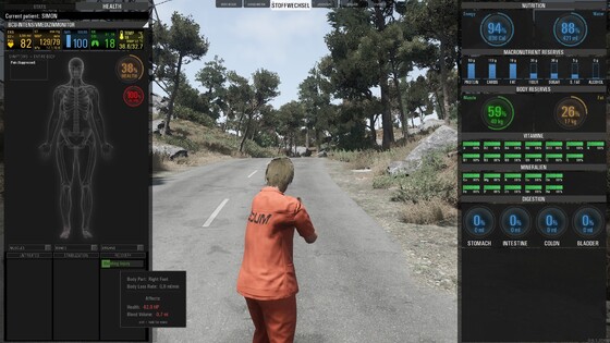 Geht ihr nun bei der Vorschau eures Körpers auf "Health", könnt ihr euch weitere Infos zur Wiederherstellung anzeigen lassen. Mithilfe vom Halten der Tasten STRG und + gibt es noch ein paar mehr Details. Unter "Recovery Rate" seht ihr, wie viel HP ihr pro Minute in etwa wieder generiert, also wie schnell die Heilung vonstatten geht. Nach einigen Minuten sollte euer Health-Tab dann wieder wie gewohnt aussehen, ohne Verletzung: