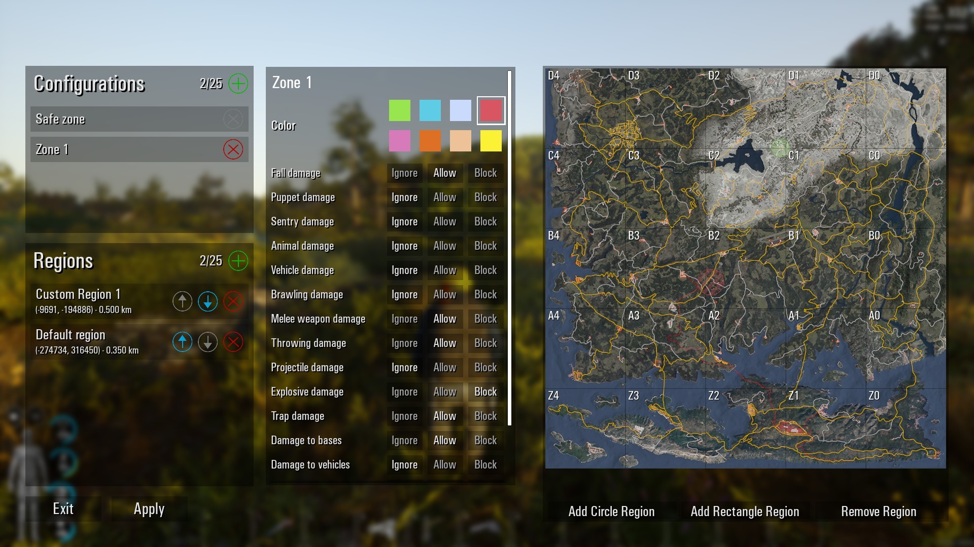 Erlauben und Blockieren sind ziemlich selbsterklärend, aber was ist Ignorieren? Nun, wenn ihr überlappende Zonen erstellen wollt und es einen Parameter gibt, den ihr von einer anderen Zone im Überlappungsbereich behalten wollt, setzt ihr Ignorieren für diesen Parameter. Andernfalls hat der Bereich, der zuerst kommt, Vorrang, oder, falls es keine Überschneidung gibt, nimmt der Parameter einfach die Standardeinstellung an.
