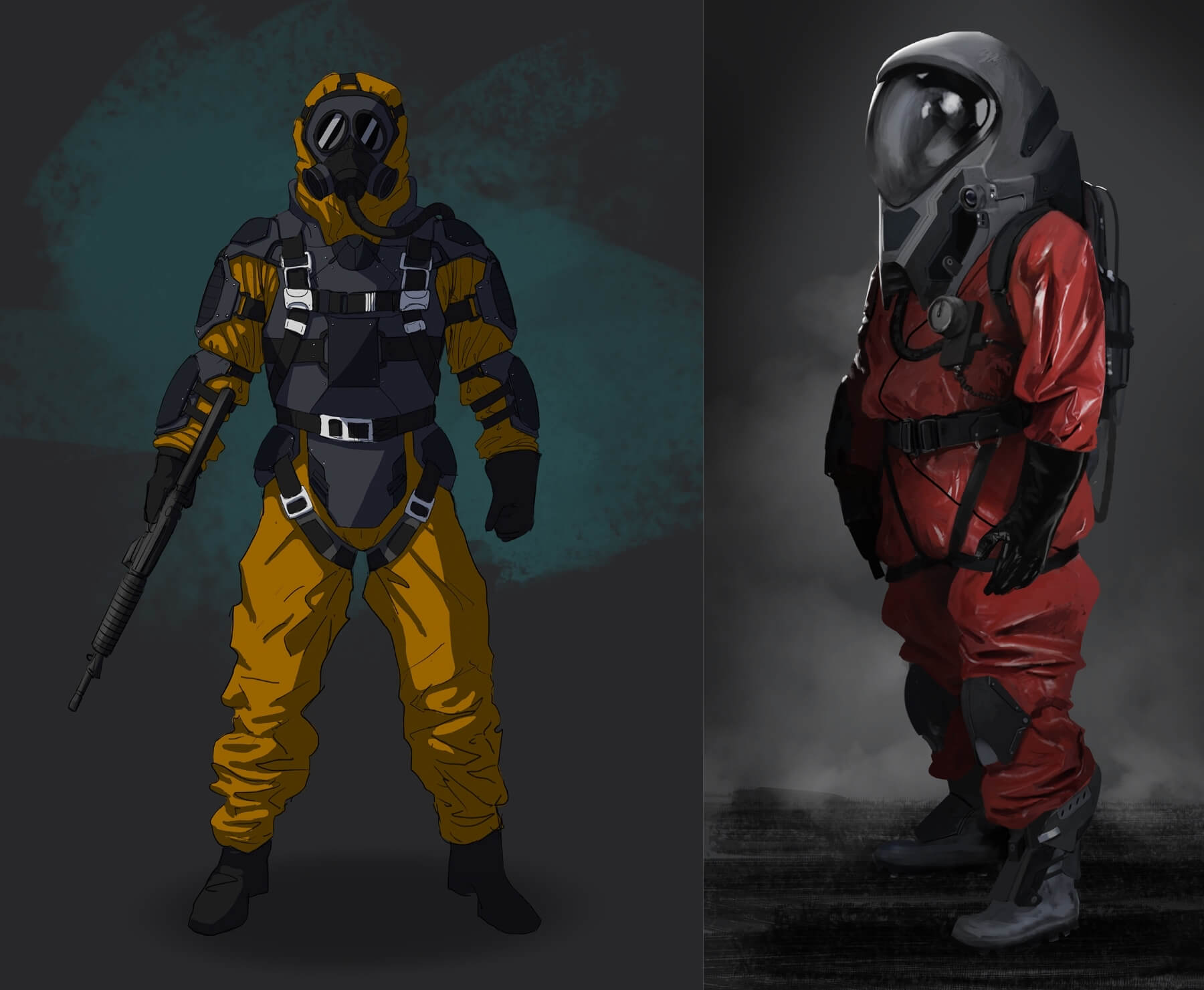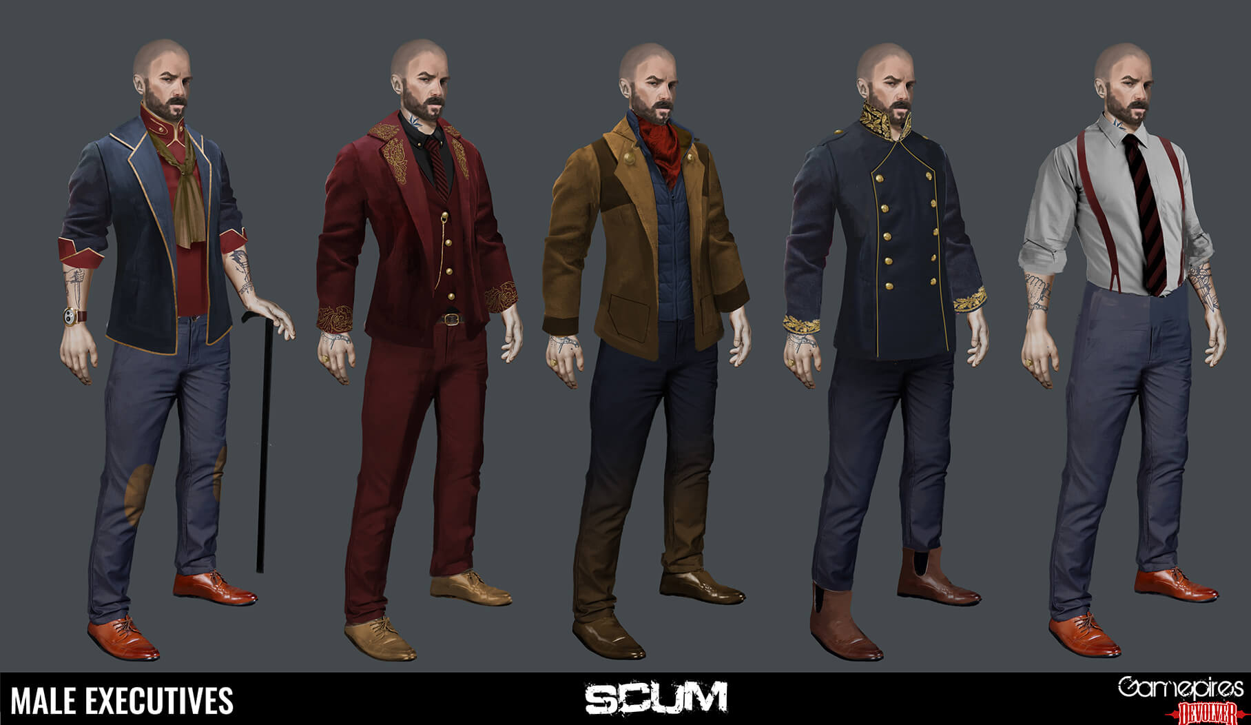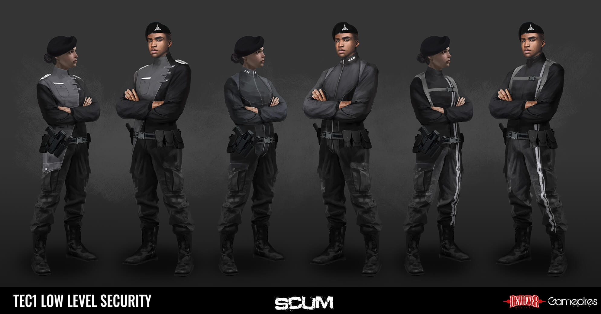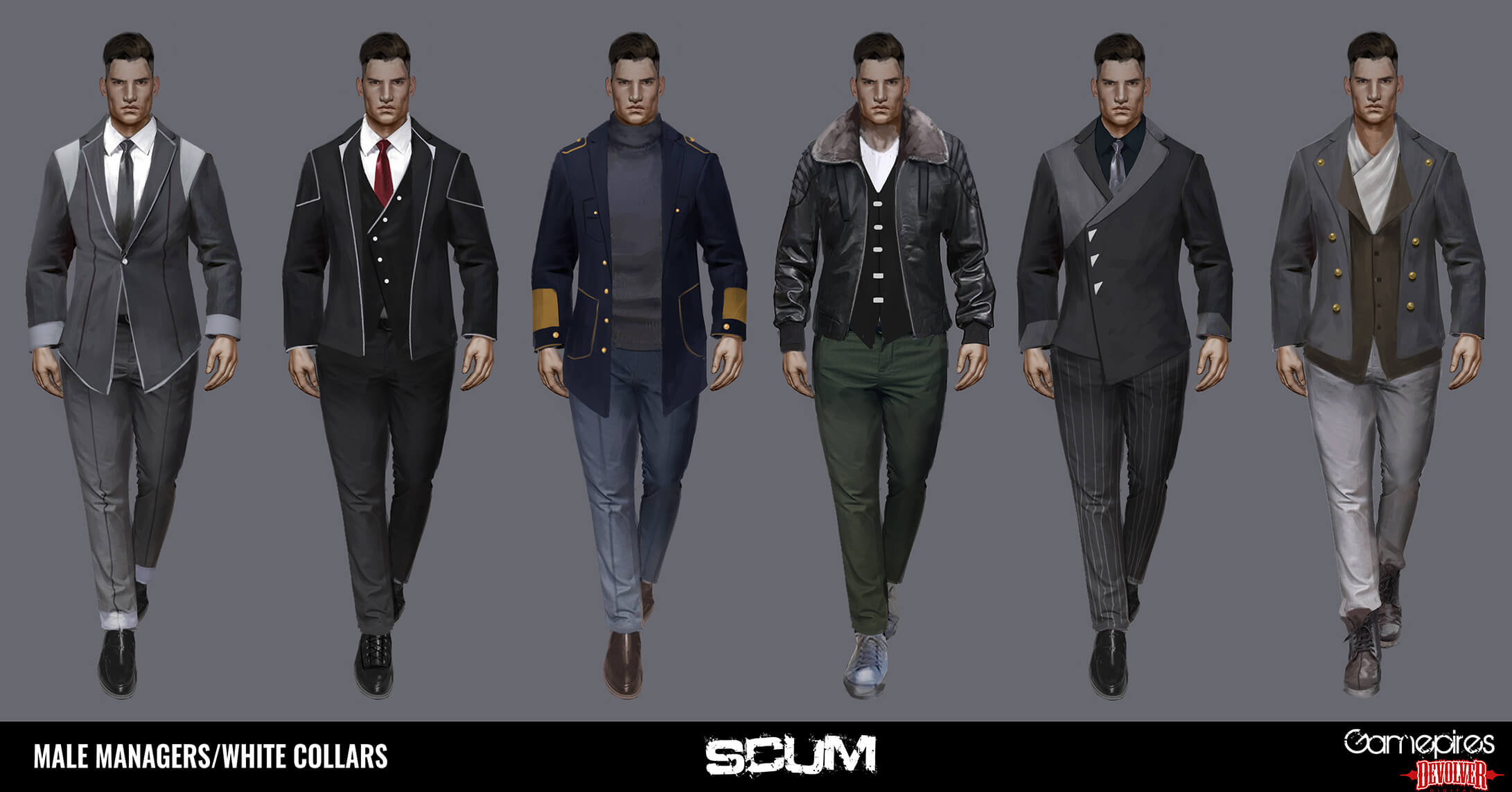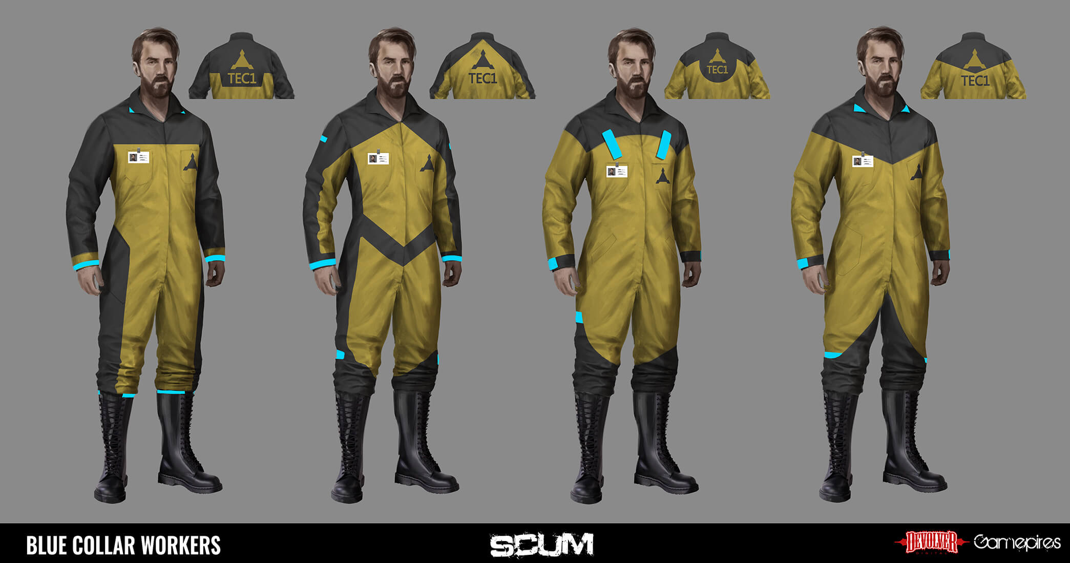 Ivona: Ich habe eine Menge Iterationen für diese Anzüge durchgeführt, von denen ihr einige auf SCUMs Twitter (@scumgame) sehen könnt. Diese beiden machten den finalen Schnitt, zusammen mit einigen anderen, und ich wollte sie zeigen, weil ich einen fortgeschritteneren Look anstrebe als die üblichen Anzüge von irl. Deshalb haben sie diese kleinen Geräte und Ausrüstung.