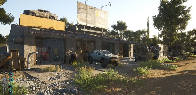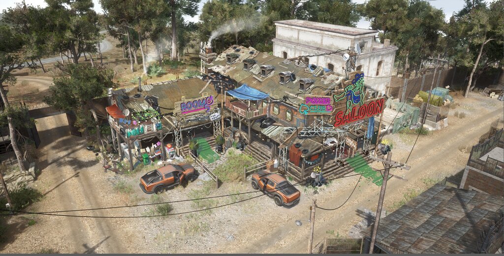- Möglichkeit, dort mit verschiedenen Waren (unter anderem Waffen und Fahrzeugen) über Handelsposten handeln zu können