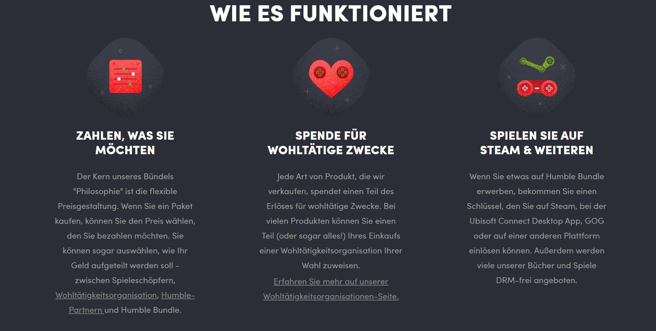 Genauer könnt ihr es hier nachlesen. Mit den Erlösen werden wie schon gesagt Wohltätige Organisationen unterstützt, die ihr aus einer breiten Palette auswählen könnt. Aber auch Indie-Entwicklerstudios und andere können mit den Erlösen bedacht werden. Die Entscheidung liegt bei euch.