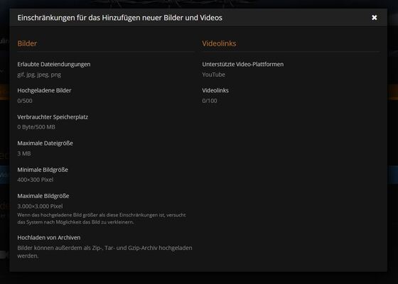 Grundsätzlich gelten die allgemeinen Nutzungsbedingungen auch hier. Unter Punkt 1.3 ist dort alles aufgelistet, was es zu beachten gibt. In der Galerie gibt es für die Bilder und Videos jedoch Einschränkungen. Als normaler User könnt ihr nur maximal 500 Bilder und 100 Videolinks hinzufügen. Speicherplatz stehen bei den Bildern euch 500 MB zur Verfügung. Eine genaue Übersicht der Einschränkungen gibt es hier: