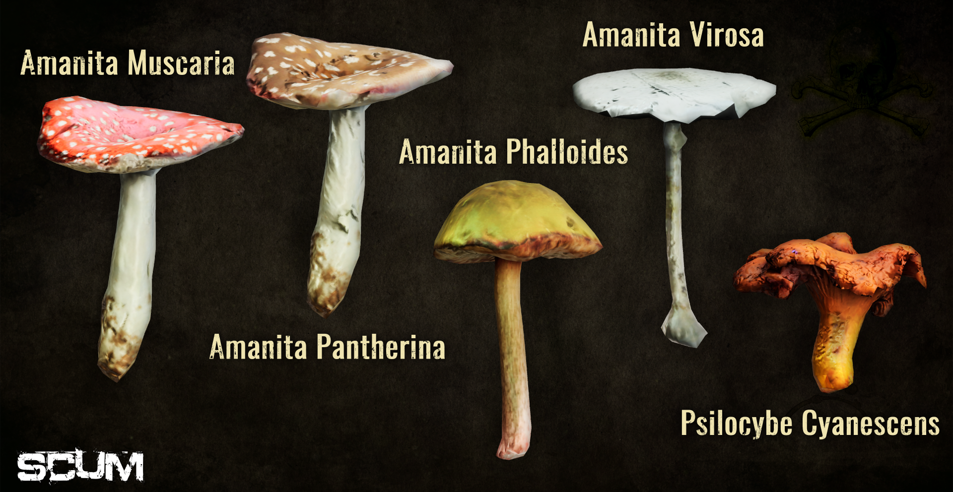 - Amanita Phalloides hat den höchsten Giftgehalt und sollte den Spieler nach dem Verzehr eines Pilzes töten, sobald die Vergiftung ihren Lauf nimmt, es sei denn, es wird mit Aktivkohle bekämpft.