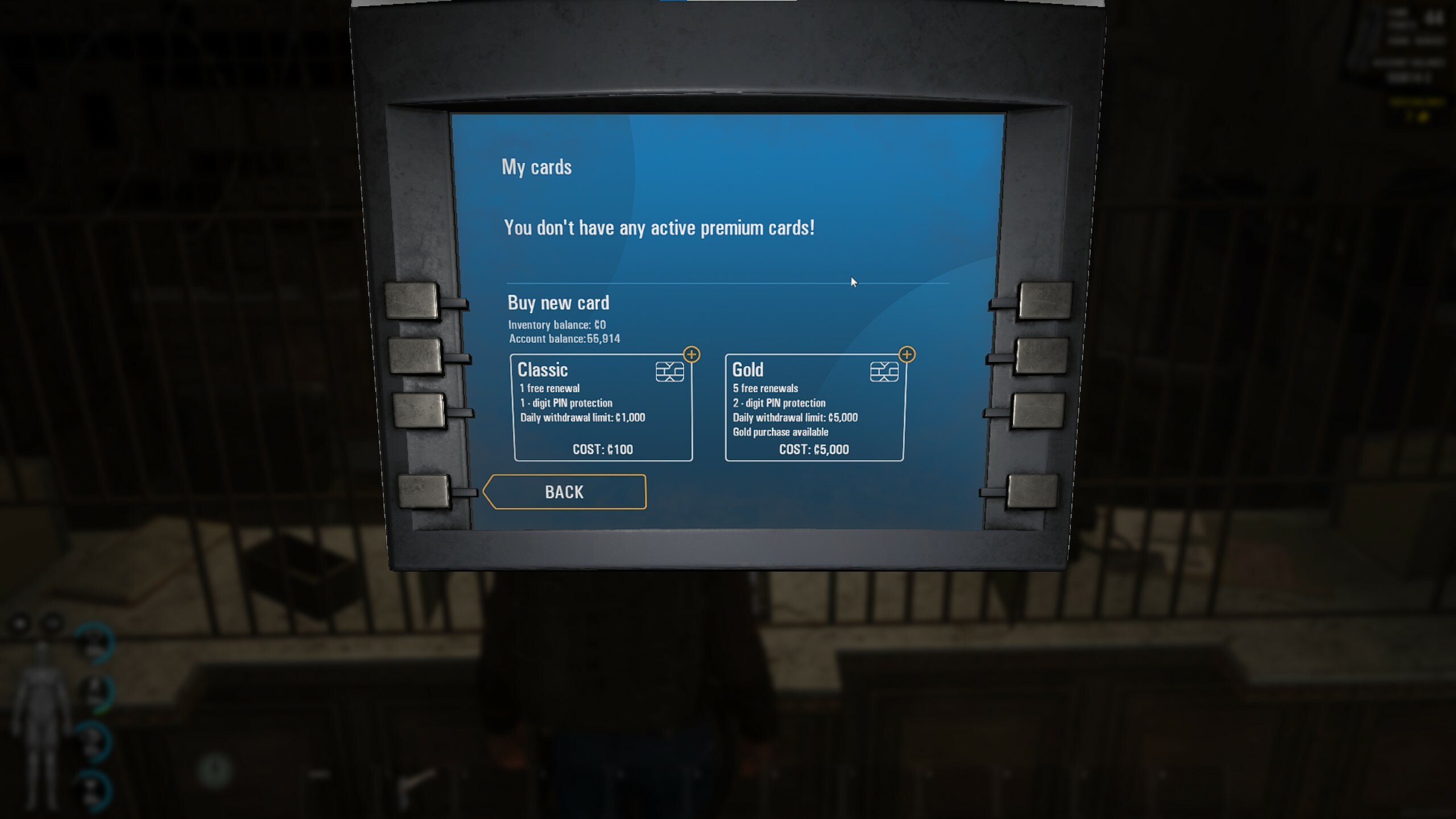 - Goldene Bankkarte - kostet $5000 und kann nur in der Bank erworben werden. Sie hat einen zweistelligen Pin-Schutz und ein tägliches Limit von $5000 für Einzahlungen/Abhebungen am Geldautomaten. Der Spieler erhält 5 kostenlose Erneuerungen, wenn er sie verliert, und muss dann jedes Mal den vollen Preis bezahlen. Die vorherige Karte wird gekündigt und es wird eine neue zweistellige Sicherheitsnummer zugewiesen. Vor allem schaltet sie die GOLD-Kaufoption frei