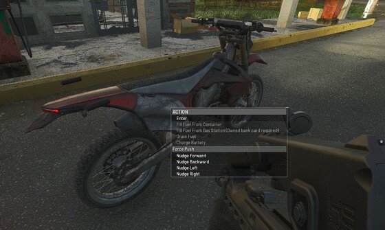 Wir werden nicht auf die Details des Dirtbikes eingehen, da Sie sie bereits bei der ersten Einführung gesehen haben, also lassen Sie uns einfach durchgehen, was neu ist. Da sie modular sind, müssen Sie natürlich Teile finden, bevor Sie sie wieder zum Laufen bringen können. Beim Bike ist es einfach: Räder. Sie müssen einen Satz Räder finden, mit denen Sie das Bike ausstatten können, bevor Sie es zur Tankstelle oder zum Mechaniker rollen können, um es mit Benzin zu füllen.