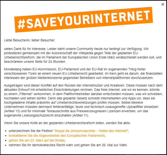 Aus diesem Grund wird am 21. März 2019 diese Webseite hier am Protest mit teilnehmen und daher für 24 Stunden nicht erreichbar sein. Ihr bekommt die folgende Meldung angezeigt: