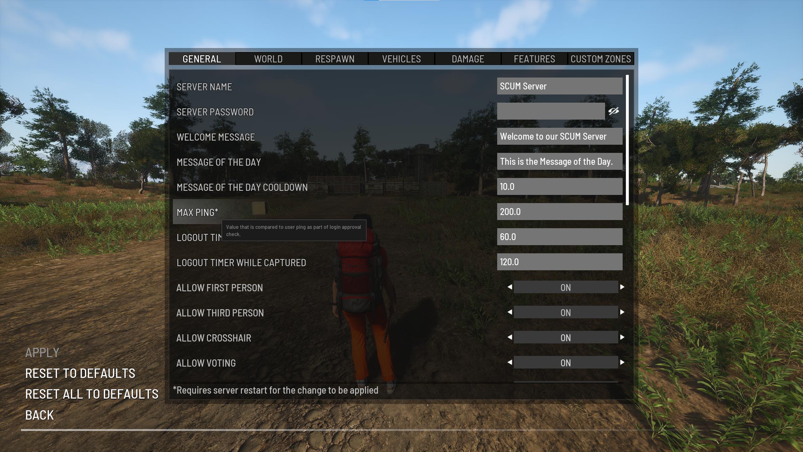 Wie ihr sehen könnt, ist hier alles schön übersichtlich. Auf separaten Registerkarten kann auf jede verfügbare Option zugriefen werden. Beachtet jedoch, dass ihr beim Veränderung der markierten Einstellungen (*) einen Neustart des Servers benötigt, damit sie aktiv sind. Dies gilt nicht bei Einzelspieler Modus.