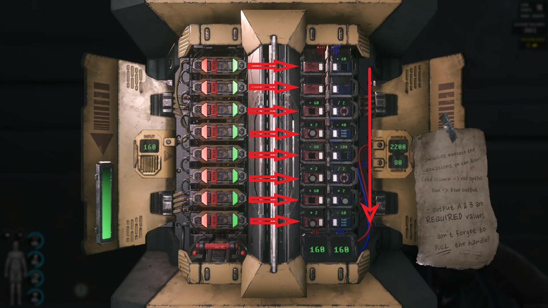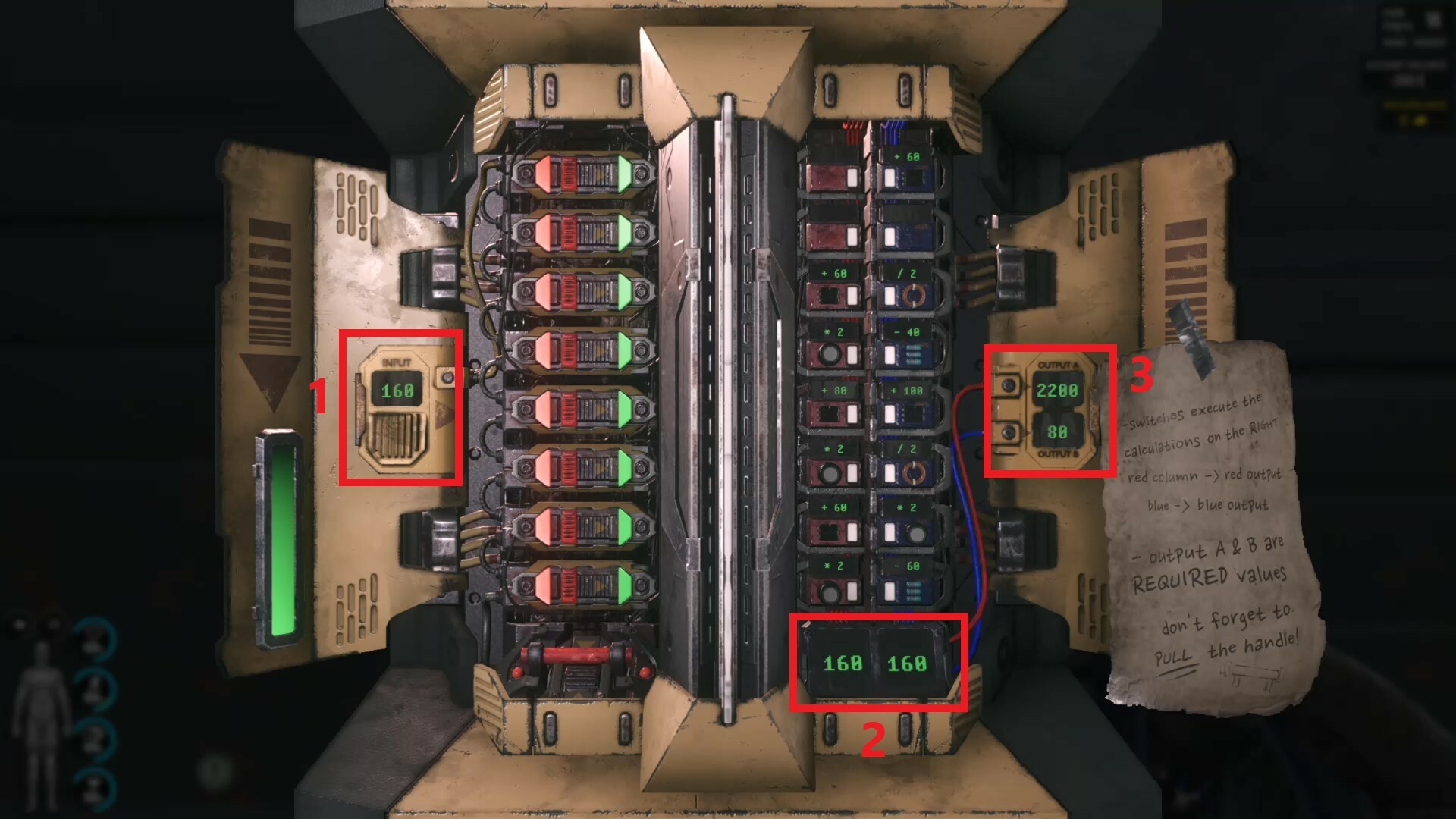 Ihr müsst die Schalter mit den korrelierten Funktionen umlegen, um die Eingangszahl in die gewünschte Zahl umzuwandeln. Auf der linken Seite findet ihr jeden Schalter, der mit seinem Paar auf der rechten Seite übereinstimmt. Die Funktionen auf der rechten Seite sind in zwei Bereiche unterteilt.