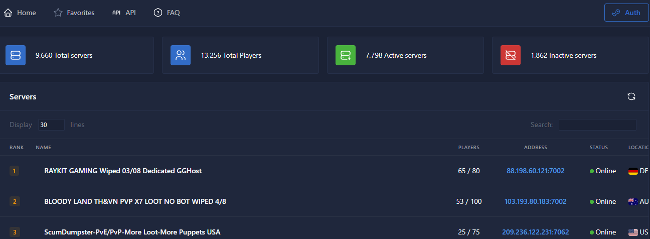 Ihr wollt wissen, wo die Action stattfindet? Mit dem SCUM-Server-Monitoring-Tool hast du einen schönen, sauberen Überblick über die aktiven Server und ihre aktuelle Spielerzahl. Sucht einfach den Server, der euch am besten gefällt, kopiert die IP des Servers und fügt sie in das Multiplay-Menü des Spiels ein - und schon seid ihr bereit! So einfach ist das!