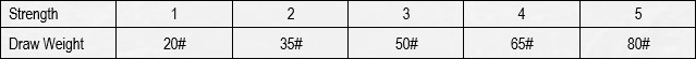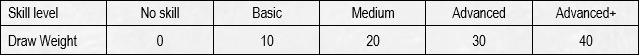 Wenn der Spieler nicht über ausreichende Stärke oder Fertigkeit verfügt, kann er die Saite nicht vollständig ziehen. In der folgenden Tabelle können Sie sehen, wie sich die Festigkeit auf ein bestimmtes Zuggewicht bezieht.
