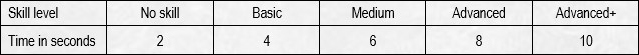 Beispiel 1 - Nehmen wir an, der Spieler hat die Fertigkeitsstufe ADV + für Bogenschießen und STR 5. Er kann 100# für 8 Sekunden lang im Vollfeld halten (10 - 2 Sekunden Strafe wegen seiner Stärke. Er könnte einen 80 # Bogen halten, er versucht aber einen 100 # Bogen).