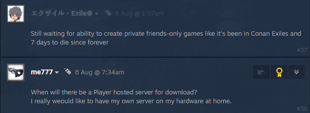 - Dies ist definitiv eine der am häufigsten gewünschten Funktionen seit geraumer Zeit. Allerdings können wir zu diesem Thema nicht mehr sagen, bevor wir 1.0 erreicht haben. Was wir sagen können, ist, dass es nicht vor dem Ende unserer Early Access Phase kommen wird und dass wir es danach in Betracht ziehen werden. Es tut mir leid, dass ich nicht mehr dazu sagen kann, aber eure Stimmen zu diesem Thema werden definitiv gehört.