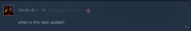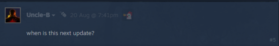 - Wir fühlen uns geehrt durch euer Verlangen nach mehr Updates, aber wir haben gerade einen Patch veröffentlicht. Das Team braucht eine kurze Verschnaufpause, aber seid versichert, dass wir uns sofort darum kümmern werden.