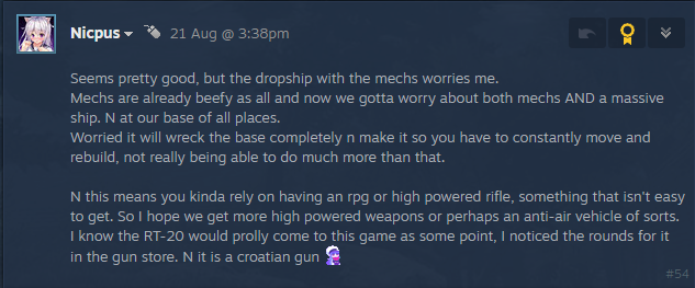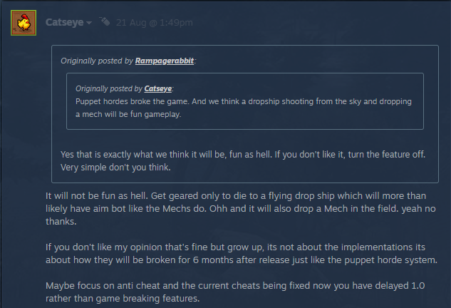 - Die Idee hinter den Abwurfschiffe war es, eine zusätzliche Herausforderung für Spieler und Teams zu schaffen, die auf den Servern am stärksten vertreten sind. Sie werden nicht diejenigen angreifen, die gerade erst mit dem Bau ihrer jungen Basen begonnen haben. Der Grund dafür ist, dass man, wenn man genug Zeit und Ressourcen hat, um konkrete Zitadellen auf der Karte zu errichten, auch die Mittel haben sollte, sich gegen die Abwurfschiffe und die Mechs zu verteidigen, die sie... abwerfen! Auf jeden Fall werden wir, wie bereits in der vorherigen Antwort erwähnt, so viel Feedback wie möglich zu dieser Mechanik sammeln und sicherstellen, dass wir alles ausbalancieren.