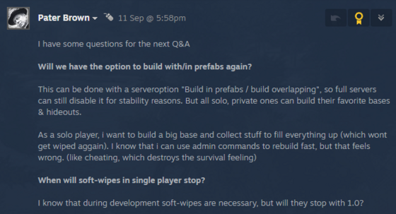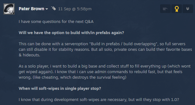 Dies kann mit einer server einstellung "Bauen in "Fertighäusern / Überschneidungen bauen" so dass volle Server sie aus Stabilitätsgründen immer noch deaktivieren können. Aber alle Solo, Privatserver können ihre Lieblings Basen und Verstecke bauen.