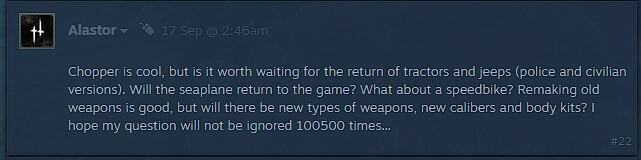 - Chopper ist cool, aber lohnt es sich, auf die Rückkehr von Traktoren und SUVs(Polizei und zivile Versionen) zu warten? Wird das Wasserflugzeug in das Spiel zurückkehren? Was ist mit dem Speedbikes? Die Neuauflage alter Waffen ist gut, aber wird es auch neue Waffentypen, neue Kaliber und Ausrüstung geben? Ich hoffe, meine Frage wird nicht 100500 Mal ignoriert.