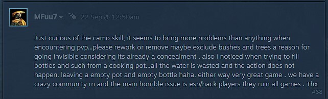 - Nur neugierig auf die Tarnung Fähigkeit, es scheint mehr Probleme zu haben als, wenn man sich in PvP befindet.... bitte überarbeiten oder entfernen Sie vielleicht ausschließen Büsche und Bäume einen Grund für unsichtbar gehen angesichts seiner bereits eine Verschleierung. Auch habe ich bemerkt, wenn Sie versuchen, eine Flaschen mit einem Kochtopf zu füllen .. verschwindet das ganze Wasser und es passiert keine Interaktion. So oder so ist es ein großartiges Spiel. Wir haben eine verrückte Community im Moment und das Hauptproblem sind Cheater, die alle Spiele ruinieren. Danke