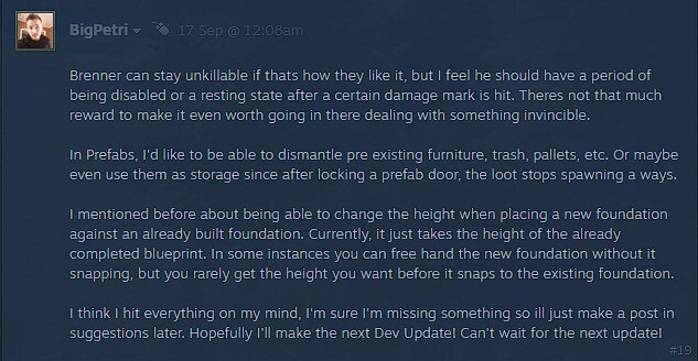 Ich denke, ich habe alles angesprochen, was mir durch den Kopf geht. Ich bin mir sicher, dass ich etwas vergessen habe, also werde ich später einen Beitrag unter Vorschläge schreiben. Hoffentlich schaffe ich das nächste Dev Update! Kann das nächste Update kaum erwarten!