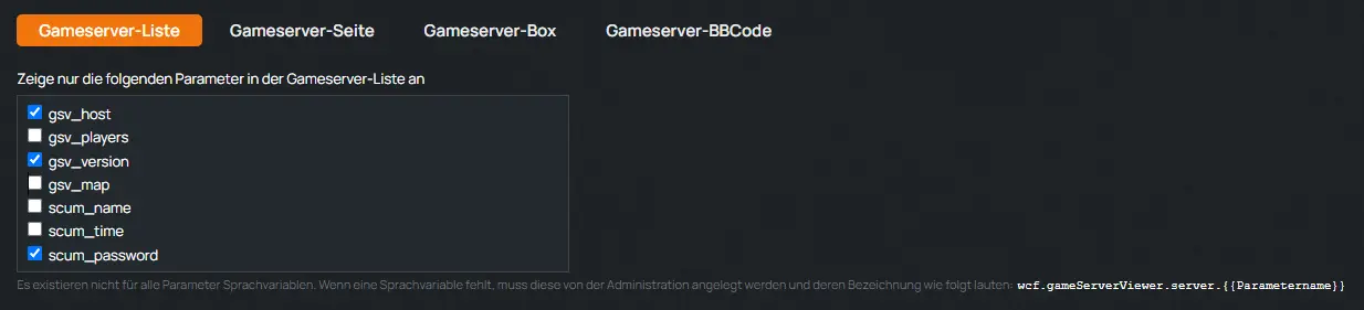 Außerdem lassen sich über die Seite "Meine Gameserver" die aktuell von sich aus eingetragenen SCUM Server einsehen sowie verwalten. Klickt ihr auf euren Server, so könnt ihr unter dem Punkt "Erscheinungsbild" noch die Daten, die in der Serverliste, auf der Serverseite selbst, in der Gameserver-Box (folgt später) oder im Gameserver-BB-Code angezeigt werden sollen, bestimmen. Es handelt sich hierbei um mögliche Parameter, die über die API abgerufen werden können: