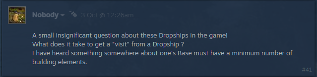 Eine kleine unbedeutende Frage zu diesen Dropships im Spiel! Was benötigt man, um einen „Besuch“ von einem Dropship zu bekommen? Ich habe irgendwo etwas darüber gehört, dass die eigene Basis eine Mindestanzahl von Bauelementen haben muss