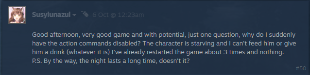 Guten Tag, sehr gutes Spiel und mit Potenzial, nur eine Frage, warum habe ich plötzlich die Aktionsbefehle deaktiviert? Der Charakter strebt und ich kann ihn nicht füttern oder ihm etwas zu trinken geben (was auch immer es ist) Ich habe das Spiel schon 3 Mal neu gestartet und nichts.