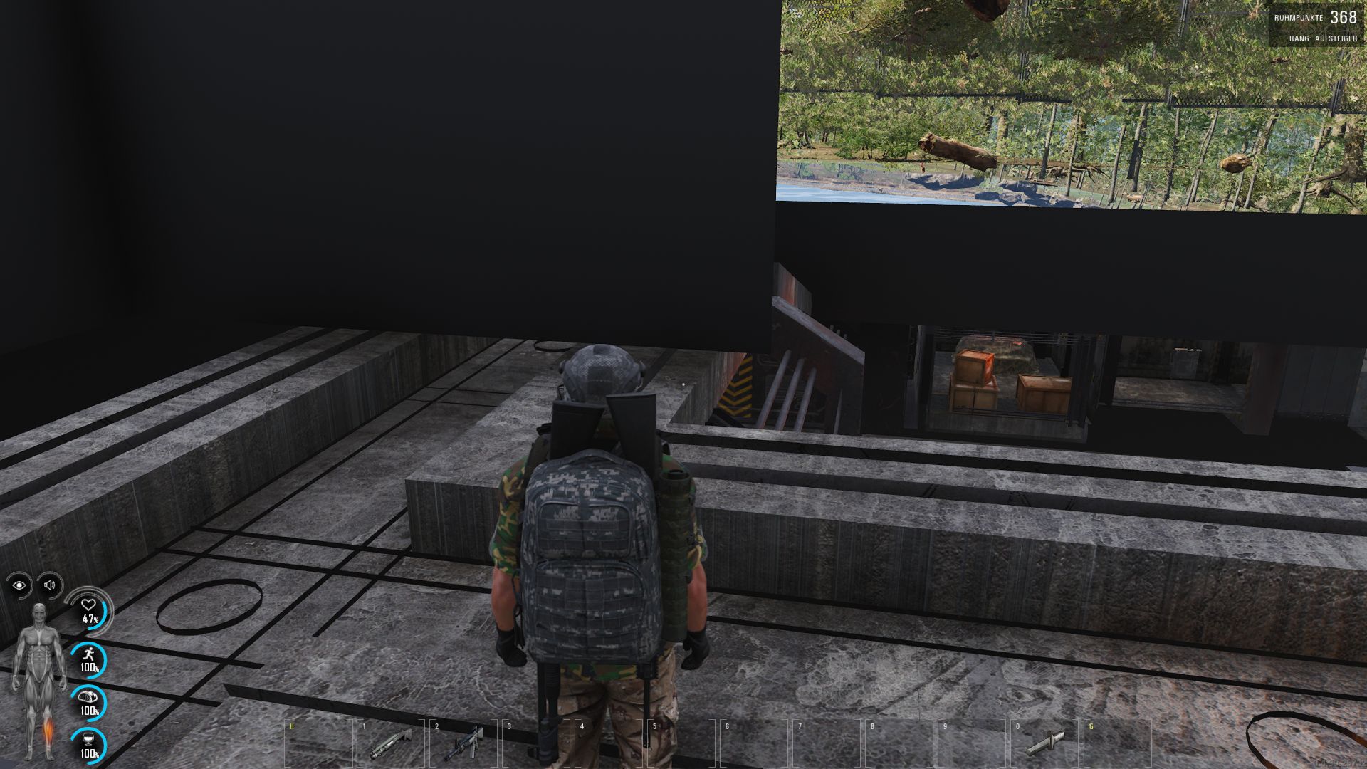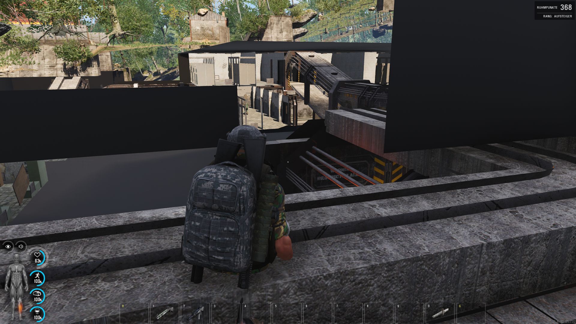 Lukentür ist geschlossen. Auf der Seite, wo sie nach dem Öffenen stehen würde - neben dem Betonbodenrand - befindet sich ein Loch, welches so nicht zu erkennen ist. Man fällt sehr tief und verliert sein Leben. Unten konnte ich eine Art Betonwanne mit 2 Laufschienen erkennen. Wahrscheinlich gehören die zum Modell der Luke. Ich habe diesen Bug 3x wiederholen können. Im Bunker selbst war nichts von meinem Char zu finden.