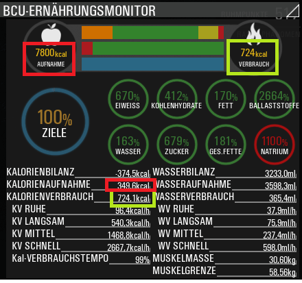 Der Wert "Verbrauch" (unter der Flamme) setzt sich von Zeit zu Zeit zurück, so auch die Werte in der tabelle. Nur der Wert "Aufnahme" (unter dem Apfel) wird zwar eine Zahl X abgezogen aber nicht genullt, wie die anderen. Wie gesagt - danach läuft alles aus dem Ruder. Darum werte ich das mal als "Bug".