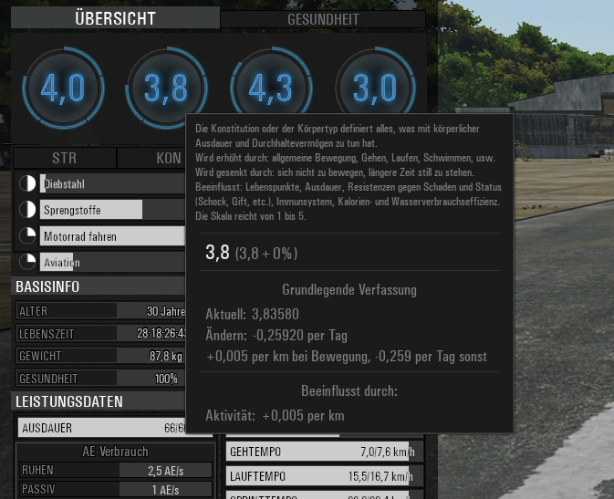 ich weiß nicht ob das gewollt ist oder ein Bug, beim Motorrad fahren zeigt er mir +0,005 KON für Aktivität an, da drüber zieht er allerdings für Inaktivität ab und der KON Wert sinkt beim Motorrad fahren.