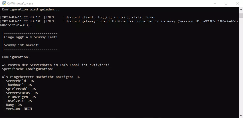 Jetzt kannst du die scommy.exe starten, und wenige Sekunden später sollte dein Bot die erste Nachricht in deinen Infokanal posten.